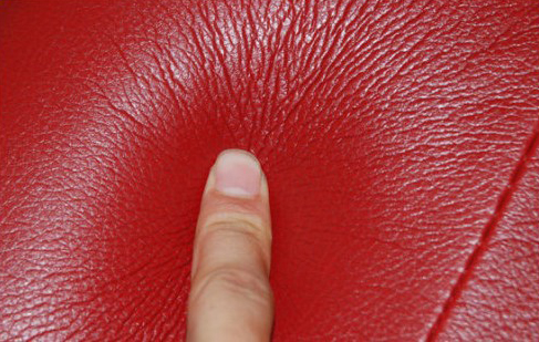 可用大拇指按压皮面,查看在拇指旁边是否有细密的皮纹纹路。如有细密的纹路、放开手后细纹消失、手袋表面丰满弹性好且粒纹平细清晰为较好的真皮;若无细小的纹路,放开手后细纹仍然存在一定的时间、手袋表面无弹性则为假皮。