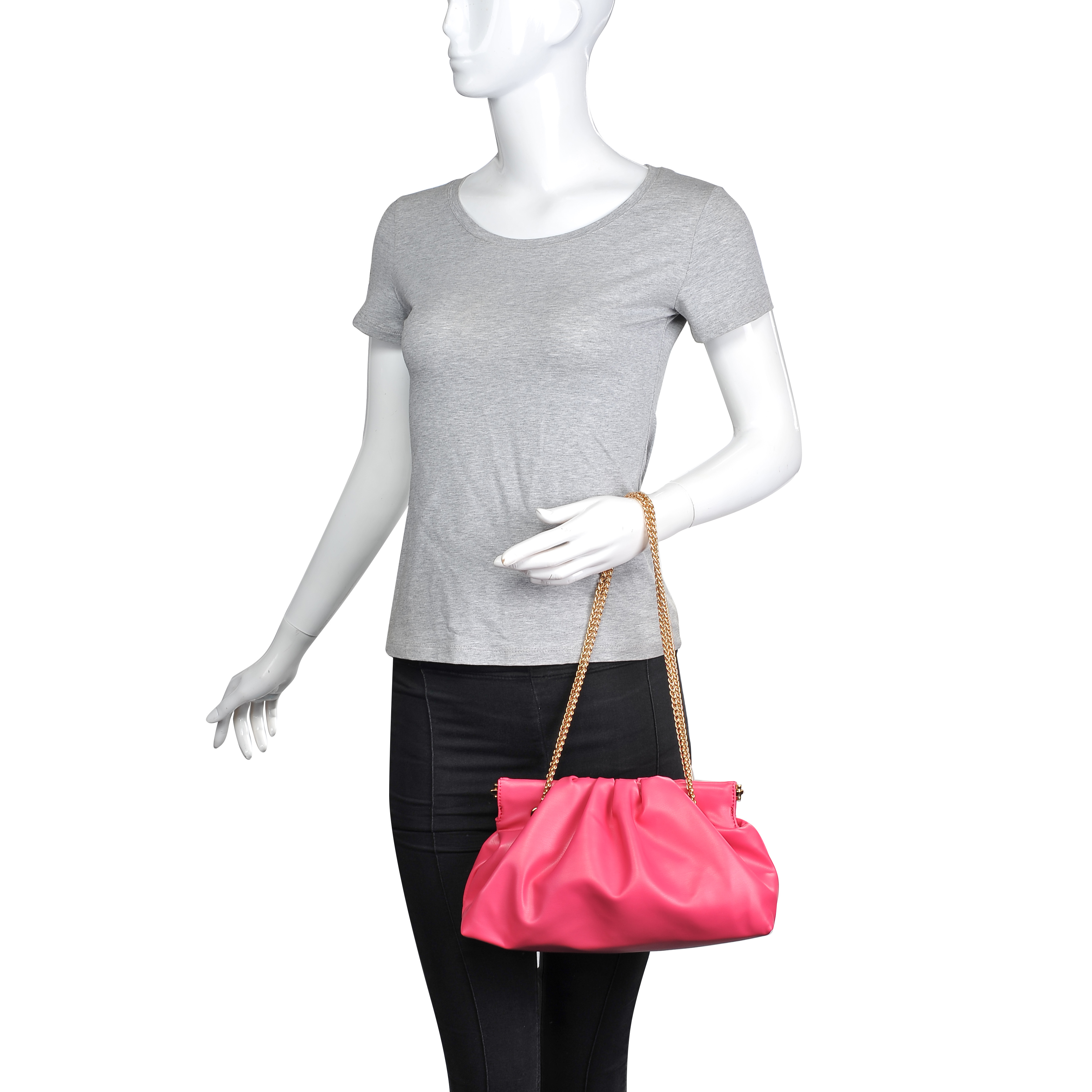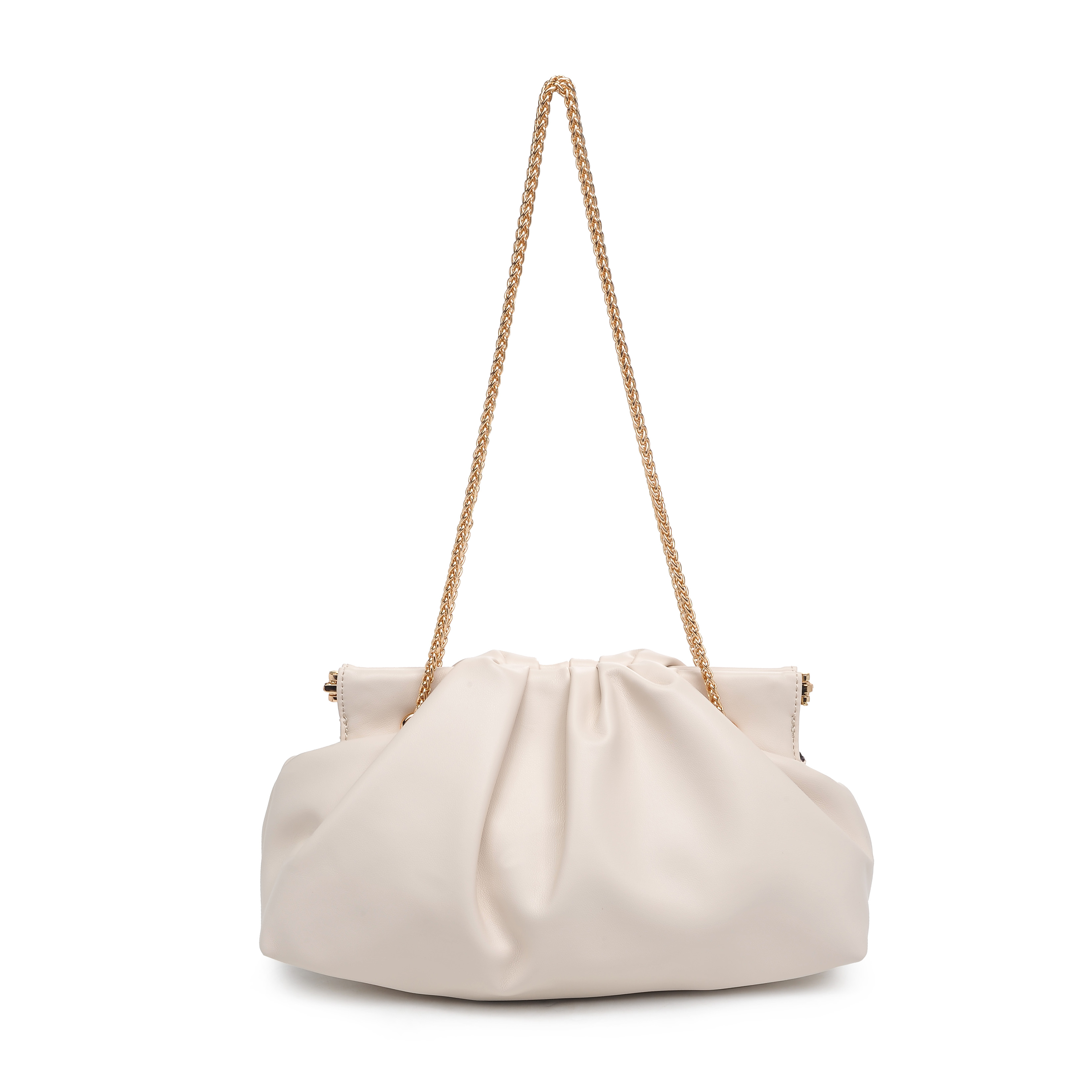 细节描述:Smooth Vegan Leather,Ruched Design,Gold Hardware, Detachable Chain Strap