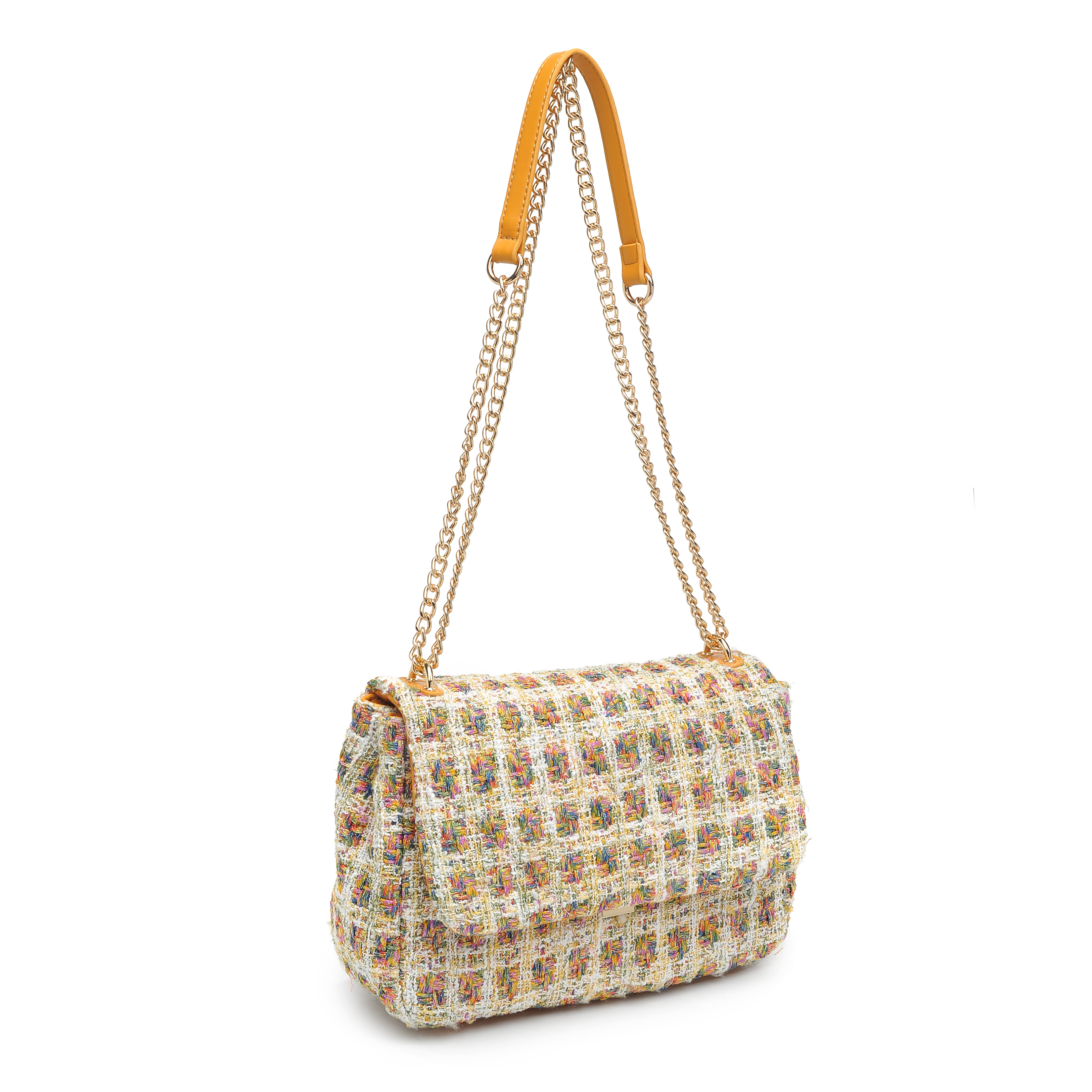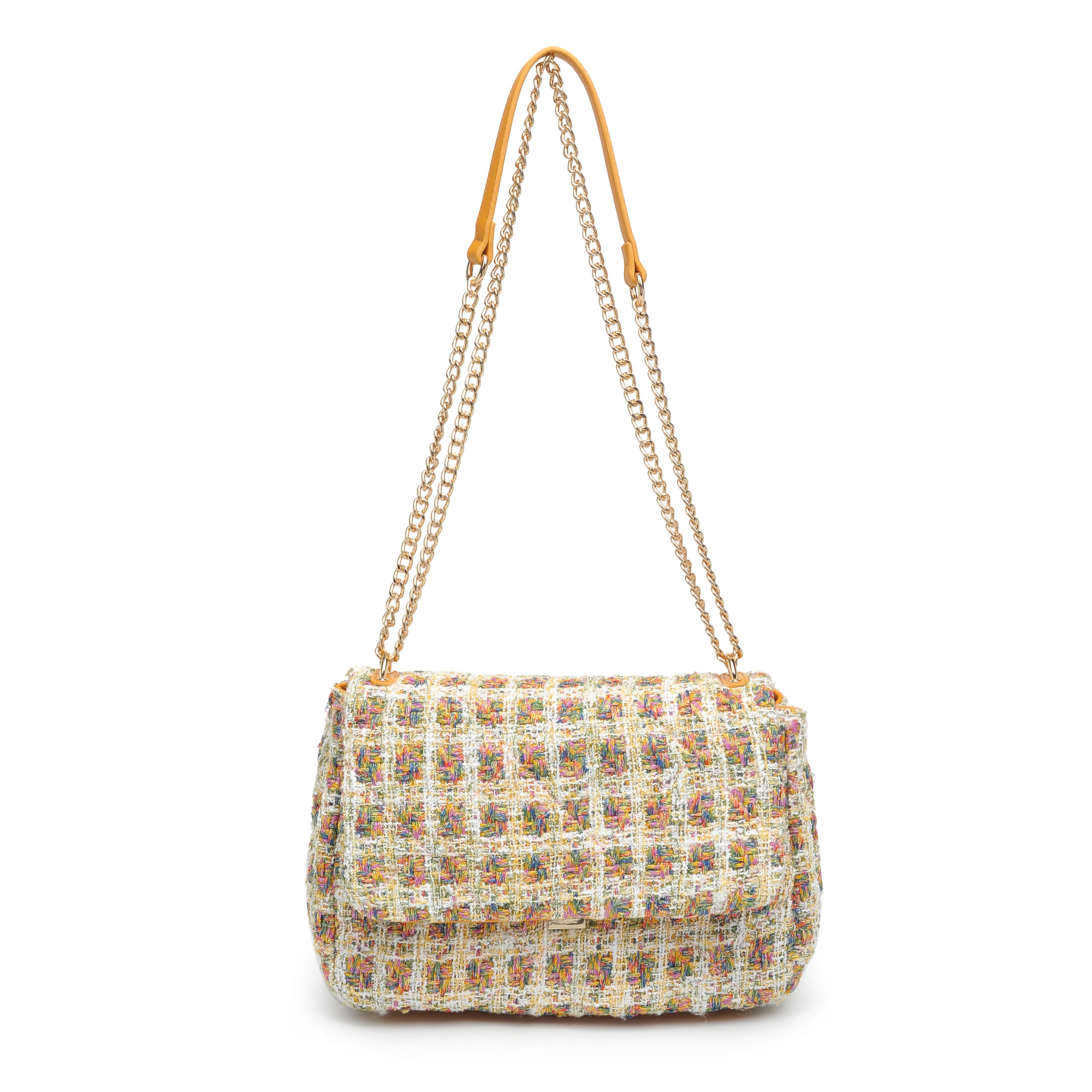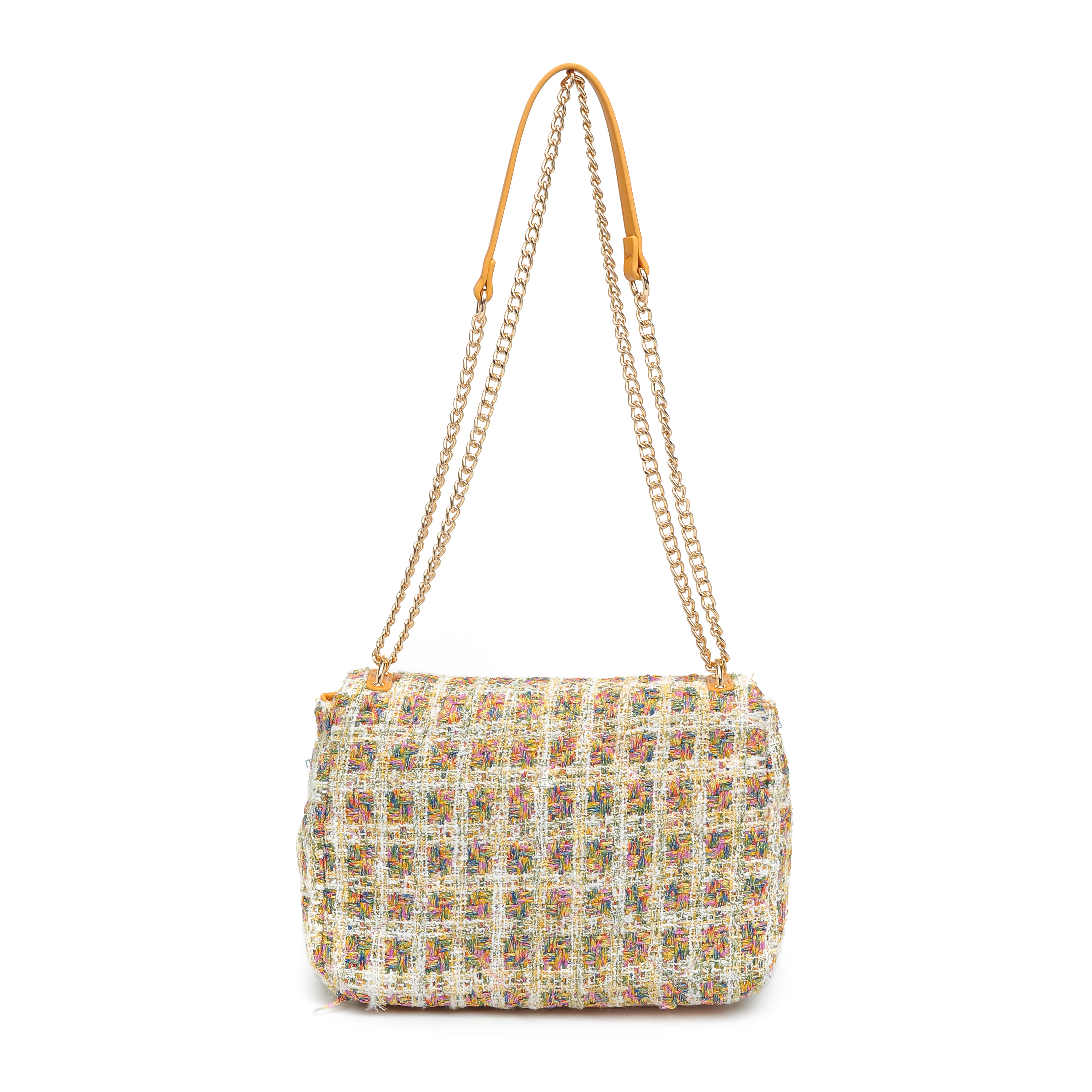 细节描述:Tweed multi-colored with gold metallic thread all-over, gold hardware,Inside Features: Fabric lined, 1 zipper pocket, 2 slip pockets