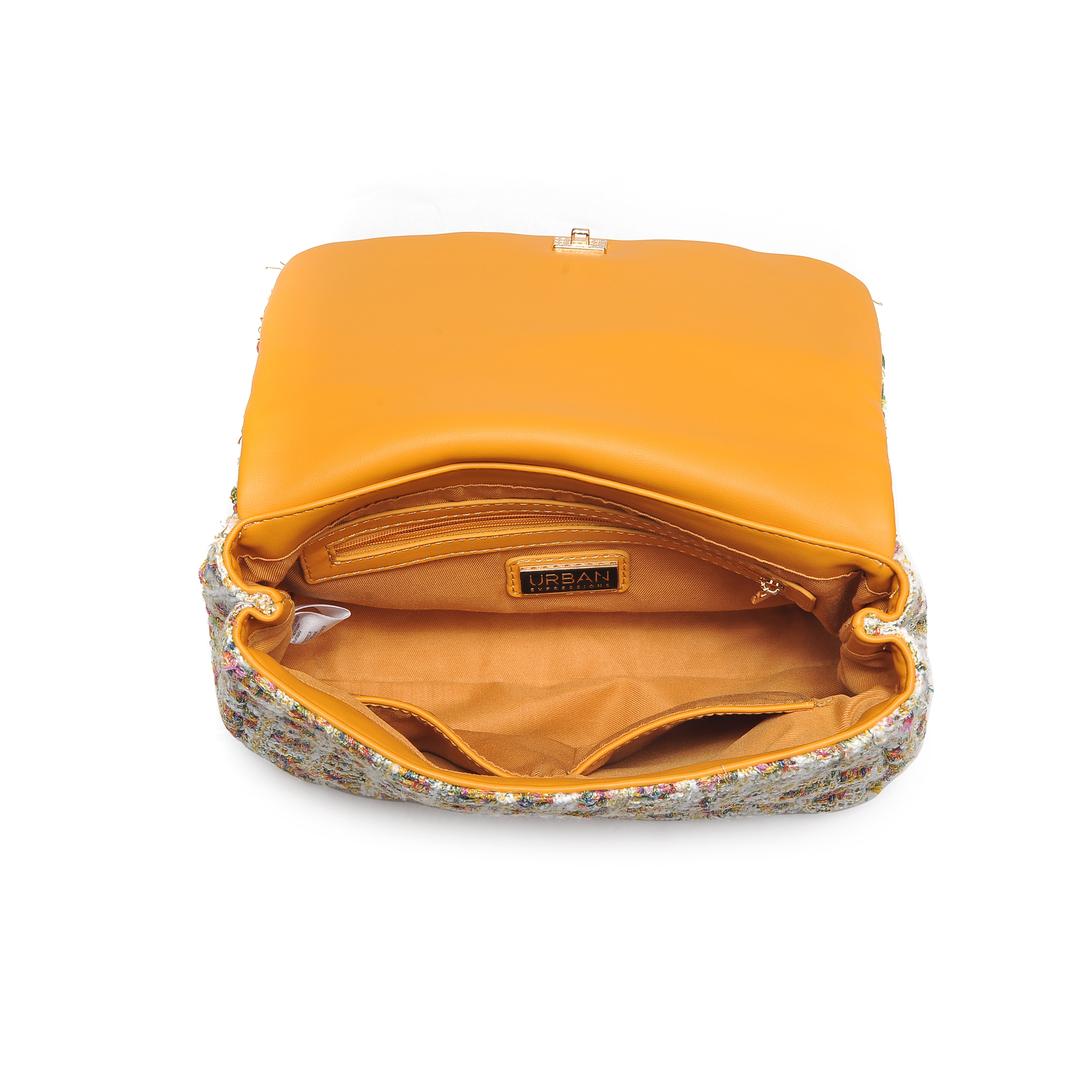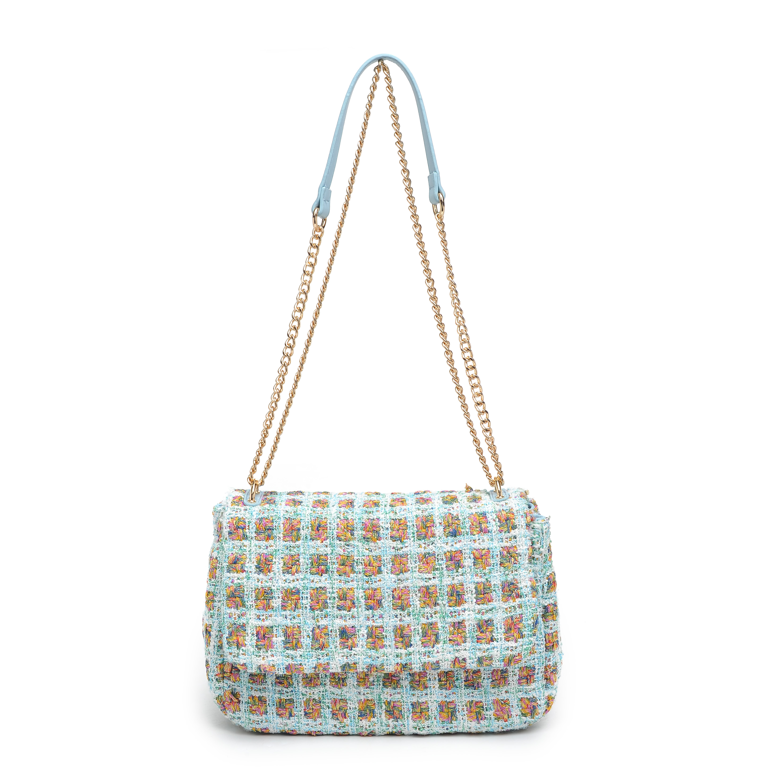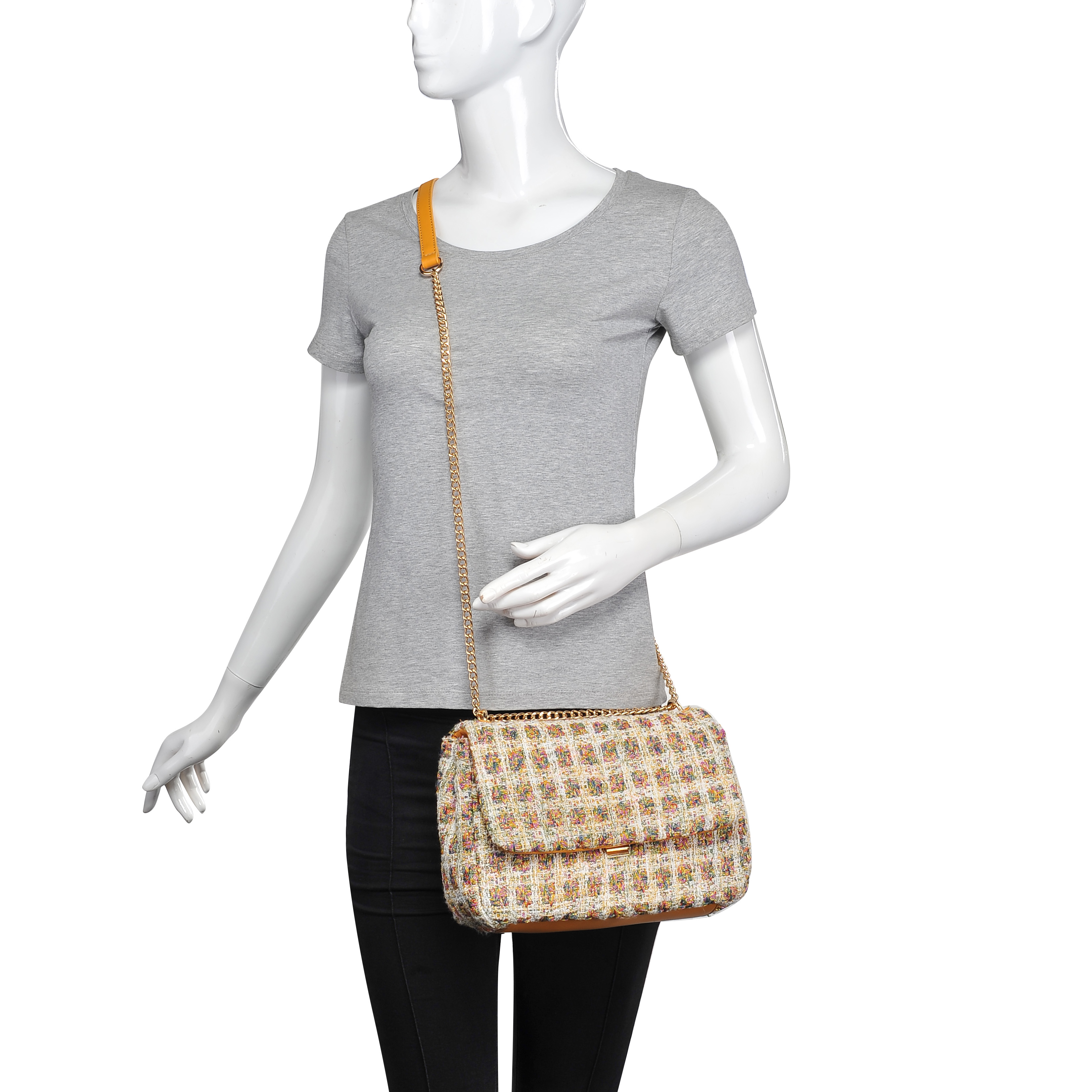 细节描述:Tweed multi-colored with gold metallic thread all-over, gold hardware,Inside Features: Fabric lined, 1 zipper pocket, 2 slip pockets